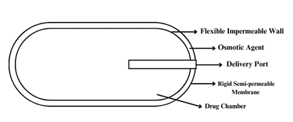 For several past year’s treatment of an acute illness or chronic disease has been mostly done by the delivery of drugs to patients using different pharmaceutical dosage forms. Consistently, the oral drug delivery has been approved as the most widely utilized route of administration in all the routes that have been known for the systemic delivery of drugs. Positively, Traditional oral drug delivery provides the rapid release of drug substance; but one can’t control release of the drug, also can’t keep an efficacious dug concentration for long at site of target [1]. The conventional oral drug delivery system comes with a lot of influencing factors like physico-chemical properties, different physiological aspects like pH of Gastro intestinal tract, presence or absence of food in stomach, motility of Gastrointestinal. To get better of this challenge the oral route were replaced by the parenteral route of administration. Parenteral route offers many advantages over oral route such as dose reduction, site targeting, bypass of hepatic route as well as stability of GI. In comparison to the conventional drug delivery system the controlled release drug delivery shows enhanced performance. The controlled drug delivery offers maintained drug concentration in bloodstream for extended period of time, this will give a prolonged therapeutic effect. The controlled release of a drug molecule can minimise the side effect as one can modulate the level of plasma concentration. On other hand, targeted drug delivery are also present which can offer specific site drug delivery by decreasing the systemic display of drug [2]. Controlled release pharmaceuticals offer constant therapeutic plasma concentration for a long period of time; and also keep concentration within the therapeutic range. Osmotic pump works by, the osmotic pressure is a driving force to create a controlled release of active molecule. The active molecule is surrounded by a semi-permeable membrane as well as osmogen mixture. Throughout the Gastro intestinal tract, the active molecule gets releases at a constant rate and it is not affected by pH factor.