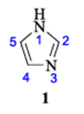 Alcohols are less acidic than imidazole, but imidazole is less acidic than carboxylic acid, phenol, and imides.Its dissociation constant is 14.5.The dissociation constant (pKa) of a basic imidazole is roughly 7, making it 60 times more basic than pyridine. The acidic proton is present in the first nitrogen atom of the imidazole ring.[16] The 1,3-diazole ring exhibits two equivalent tautomeric forms because each of the nitrogen atoms have a positive charge (Fig. 2).[17]