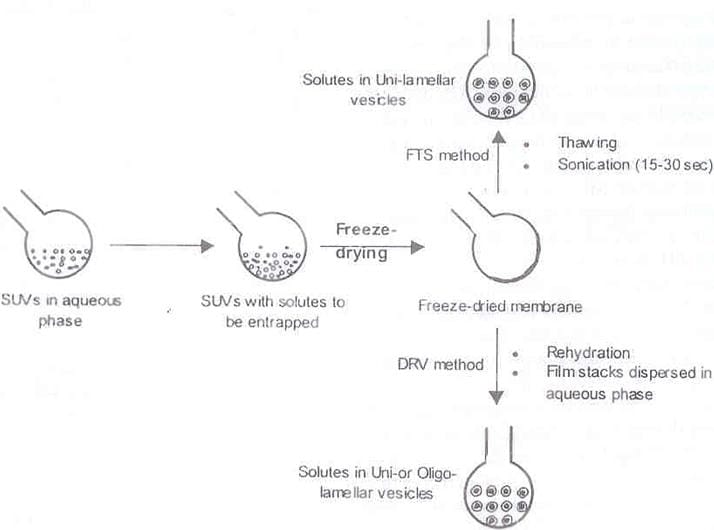 This method starts with freeze drying of a dispersion of empty SUVs. After freeze drying the freeze dried membrane is obtained. Then these freeze dried SUVs are rehydrated with the use aqueous fluid containing the material to be entrapped. This leads to formation of the solutes in oligolamellar vesicles.
