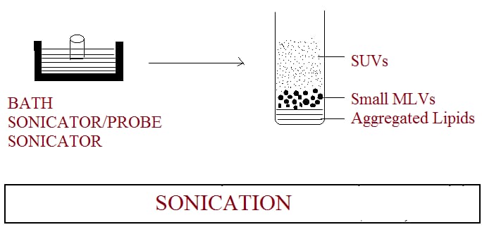 This is the procedure by which Multi Lamellar Vesicles (MLVs) are converted into small Uni Lamellar Vesicles (SUVs). Ultrasonic irradiation is applied to the MLVs to produce the SUVs. Two techniques are utilized: a) Probe sonication method, and b) Bath sonication method. The probe method is used for dispersion and requires high energy for small volumes (for instance, high concentrations of lipids or a viscous aqueous phase), while bath sonication is better suited for larger volumes of diluted liquids. The probe tip sonicator delivers a substantial amount of energy to the liquid dispersion but can lead to overheating of the liposomal dispersion, resulting in lipid degradation. Additionally, the sonication tip may introduce titanium into the liposome dispersion, which can be removed through centrifugation before use. For these reasons, bath sonicator tend to be more commonly employed. The sonication of MLVs is performed by either placing the dispersion in a bath sonicator or immersing the probe tip into the test tube containing the dispersion (for a duration of 5-10 minutes). Following sonication, the resulting dispersion is centrifuged, and as illustrated in the diagram, the SUVs will remain at the top while the smaller MLVs and aggregated lipids settle at the bottom. The upper layer consists of a pure dispersion of SUVs with varying diameters, as size is influenced by factors such as composition, concentration, temperature, duration of sonication, volume, and sonication tuning.