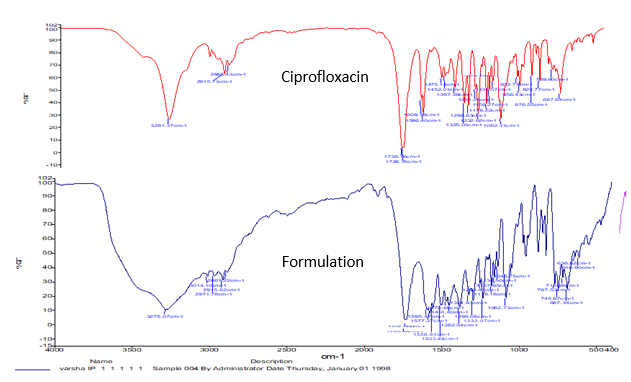 FT-IR Studies were conducted for pure drug (Ciprofloxacin, Ibuprofen) and also Formulation. To predict the interaction and compatibility studies in between drug and the co-former.