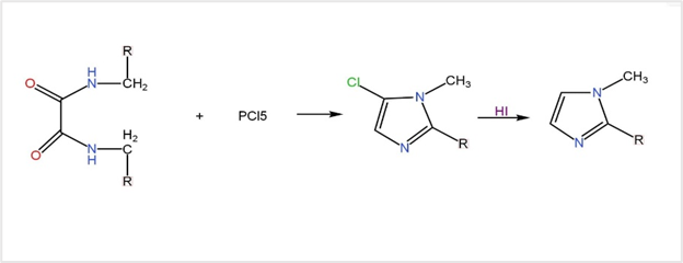 According to Wallach, N, N-dimethyloxamide when reacts with phosphorus pentachloride, results in a chlorine containing compound, which on further reduction with hydroiodic acid gives N-methyl imidazole. Under the same conditions when N, N-diethyloxamide is converted into chlorine compound. On reduction it gives 1-ethyl-2-methyl imidazole. [11]