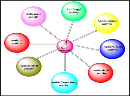 Nitrogen containing heterocyclic rings play a key role in development of pharmaceutical products. The main aim of a chemist is to develop the drugs with enhanced efficacy and duration of action and to decrease their toxicities and side effects. [1] Imidazole and its derivatives are the fundamental heterocyclic compounds in medicinal chemistry. It was first synthesized by Heinrich Debus in the year 1858. Imidazole belongs to the class of five membered heterocyclic compound that possess two nitrogen atoms, three carbons, four hydrogen atoms and two double bonds in it. The term Imidazole was coined by Arthur Rudolf Hantzsch in 1887. It is also familiar as 1, 3-diazole. The current literature layout much information regarding the synthesis, physicochemical characteristics, biological role and functionalization of imidazole. It acts as a catalyst in synthesis and process of new drug development and also included in chemical sciences, biological sciences and material sciences. Imidazole and its derivatives shows wide spectrum of biological activities such as antibacterial, anti-inflammatory, antifungal, anticancer, antidepressants, analgesic, antihistamine, antiprotozoal, antimalarial, antiviral, anthelmintic activity. It is amphoteric in nature, because it acts as both an acid and base. [2, 3, 4, 5]