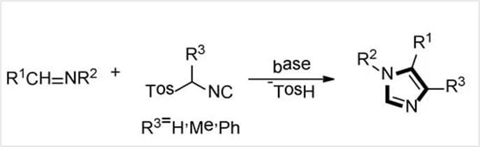 In the year 1997, van Leusen et al. first declared that TosMIC and aldimine undergoes a base-induced cycloaddition reaction in a proton solvent. They discovered that alpha-silylbenzyls isocyanate and alpha-tosylethyl isocyanate gives 1,4,5-trisubstituted imidazole. [2]