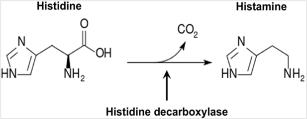 Histamine is primarily produced by mast cells, basophils, enterochromaffin-like cells (ECL) in the stomach and histaminergic neurons in the basal ganglia of the brain in mammals. It is a monoamine synthesized from Histidine, an amino acid catalyzed by the enzyme histidine decarboxylase. [9]
