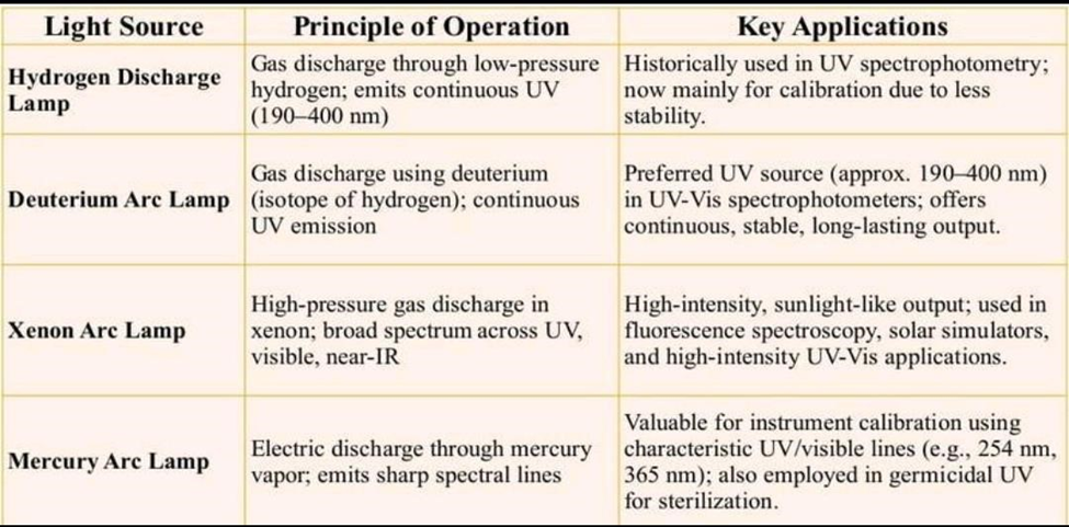 Common light sources used in UV-Vis Spectrophotometers