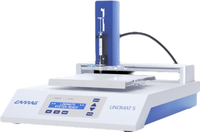 For quantitative HPTLC, there are automated instruments available for applying samples. The spray-on methods are commonly used with devices like the Linomat 5 or Automatic TLC Sampler (ATS) 4. The sample syringe is typically operated by a motor, and both the volume and delivery speed are electronically controlled. A stream of inert gas like nitrogen is directed around the syringe tip to atomize the sample and produce a band on the TLC/HPTLC plate when either the syringe or the plate moves linearly. Applying samples in bands helps improve separation and enhances densitometric detection. The highest resolution and sensitivity are obtained when the sample is applied as narrow bands. Although circular spots have some disadvantages, the “line” or “band” application offers several advantages.[ 18]