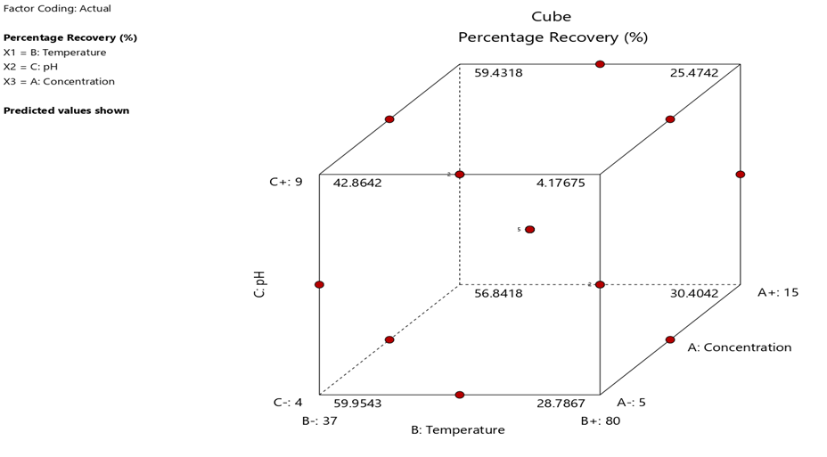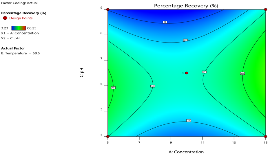For conducting the study, we assume that the compound is stable at different condition and it is checked by measuring its percentage recovery28. Here we consider concentration, temperature and pH as independent variables and percentage recovery as dependent variables29. Several trial runs using all three possible combinations of these factors were performed30. The contour plot was created using data representing the relationship between the three parameters31. Box-Behnken design was constructed using the data obtained, and the significance of the method was checked using p-value and f-value obtained from the ANOVA table32.