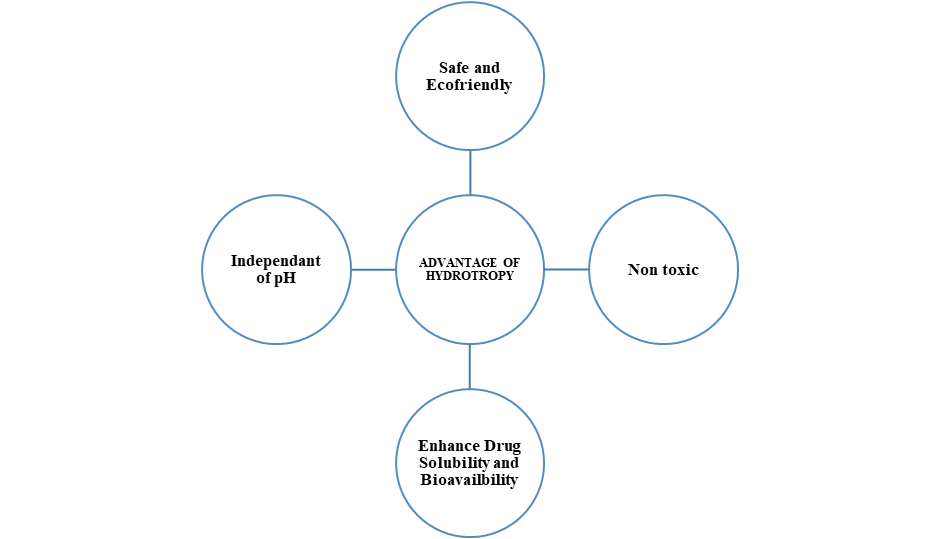 Hydrotropic Solubilization Technique is used for enhancing solubility of poorly soluble drugs. Hydrotropy can be defined as a phenomenon which involves the solubilization where incorporation of a large amount of another solvent termed as co-solvent with aqueous phase contributes in an increase in aqueous solubility of that solute7.