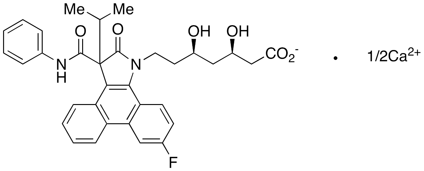Atorvastatin calcium is a white to off-white crystalline powder, structurally classified as a pyrrole-based statin. The drug exists as a calcium salt with the empirical formula (C??H??FN?O?)?Ca·3H?O and a molecular weight of approximately 1209.4 g/mol. Its IUPAC name is (3R,5R)-7-[2-(4-fluorophenyl)-3-phenyl-4-(phenylcarbamoyl)-5-(propan-2-yl)-1H-pyrrol-1-yl]-3,5-dihydroxyheptanoic acid calcium salt (2:1) [1–3,14,15]. The molecule consists of a heptanoic acid side chain with two chiral centers at the 3 and 5 positions, both of which are in the (R)-configuration, essential for optimal inhibition of HMG-CoA reductase. It contains lipophilic aromatic rings, a fluorophenyl moiety, and multiple polar functional groups, contributing to its amphiphilic character. This structural diversity necessitates careful analytical considerations during method development [1–3,14,15].