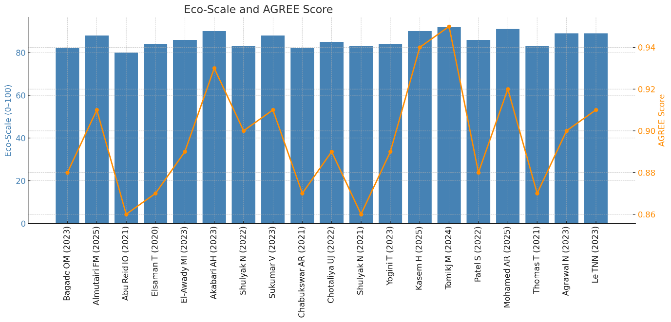 The assessment of analytical methods using the Analytical Eco?Scale reveals a strong commitment to green chemistry principles across all 19 evaluated studies. With scores ranging from 80 to 92, every method qualifies as an “excellent green analysis,” as per the Eco?Scale interpretation criteria, where a score above 75 reflects environmentally favorable practices. The highest scorers—Tomikj?M (2024), Mohamed?AR (2025), Kasem?H (2025), and Akabari?AH (2023)—demonstrated outstanding greenness (scores ≥ 90), likely due to their use of non-toxic solvents, reduced reagent volumes, low energy consumption, and minimal hazardous waste generation. These methods set a benchmark for environmentally sustainable analytical practices. In the mid-range group, methods scoring between 84 and 86, such as those reported by El?Awady?MI (2023), Patel?S (2022), and Sukumar?V (2023), also showcased sound environmental design, though there may be room for improvement in terms of solvent selection or process efficiency. The relatively lower yet still excellent scores, observed in methods like those by Abu?Reid?IO (2021), Bagade?OM (2023), and Thomas?T (2021), which ranged between 80 and 83, may indicate the use of more hazardous solvents, higher reagent consumption, or greater energy requirements. Nevertheless, even these methods reflect a conscious effort toward greener practices. A notable trend is the higher Eco?Scale scores in more recent publications, highlighting the increasing awareness and adoption of green analytical chemistry over time. While AGREE scores were also uniformly high, the Eco?Scale provided more sensitivity in distinguishing subtle differences in environmental performance. Overall, this comparison underscores the positive trajectory toward environmentally responsible method development in pharmaceutical analysis (Figure 3). Continuous efforts such as adopting greener solvents, miniaturizing procedures, and optimizing energy usage can further enhance the sustainability of these analytical techniques.