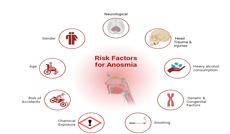 Anosmia-an impaired sense of smell-is a sensory disorder dependent on various other factors such as age, medical conditions, exposure to the environment, and genetics(4). About 50% of people aged 65 and older have olfactory dysfunction, with anosmia being the first clinical sign in 70 to 90% of those with neurodegenerative diseases like Parkinson's or Alzheimer's. The emergence of post-viral anosmia after infections with, for example, influenza and COVID-19 has caused a surge in interest worldwide, with a sizeable fraction of patients affected(5). Head trauma causes 5 to 20% of it, and environmental factors such as smoking and pollution also play a role. Congenital anosmia is rare but recognized since it is caused by genetic disorders like Kallmann syndrome. Studies estimate that about 20% of the general populace has some form of olfactory dysfunction and about 3 to 5% complete anosmia. The incidence of this disorder increases with age, at 25% of ages 50 to 60 and almost half at ages 65 and older. Some studies say that in cases of COVID-19, 40 to 80% of infected individuals had temporary or long-term olfactory dysfunction. The burden of anosmia underscores the need for new diagnostic, preventive, and treatment strategies(6).