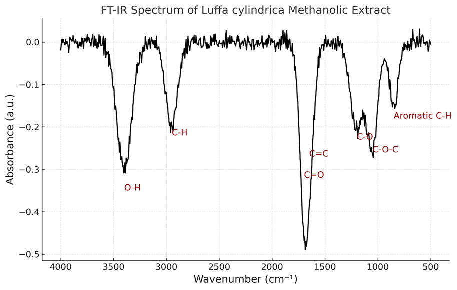 The FT-IR spectrum of the methanolic extract of Luffa cylindrica was recorded in the range of 4000–400 cm?¹ to identify the functional groups associated with its phytoconstituents. The spectrum revealed several characteristic absorption bands corresponding to major bioactive compounds. A broad band at 3400–3200 cm?¹ indicated O–H stretching vibrations, confirming the presence of hydroxyl groups associated with phenols, flavonoids, and tannins. A distinct absorption at 2920–2850 cm?¹ corresponded to C–H stretching of alkanes, suggesting the presence of terpenoids and fatty acid derivatives. A strong peak at 1730 cm?¹ was attributed to C=O stretching vibrations, indicating the occurrence of carbonyl-containing compounds such as flavonoid glycosides and saponins. The band at 1620–1600 cm?¹ was assigned to C=C stretching of aromatic rings, supporting the presence of phenolic and flavonoid compounds. Peaks observed in the region of 1260–1200 cm?¹ indicated C–O stretching, while a significant band at 1100–1050 cm?¹ corresponded to C–O–C glycosidic linkages, both of which confirmed the presence of glycosides and saponins. Additionally, a band at 880–800 cm?¹ represented aromatic C–H bending vibrations, further supporting the presence of polyphenolic compounds. "The FT-IR spectrum of Luffa cylindrica methanolic extract revealed prominent peaks corresponding to hydroxyl, carbonyl, aromatic, and glycosidic groups, confirming the presence of tannins, flavonoids, saponins, glycosides, and terpenoids. These findings align with TLC and column chromatography results, further validating the phytochemical profile responsible for its pharmacological activities, including anthelmintic, antimicrobial, and antioxidant properties."