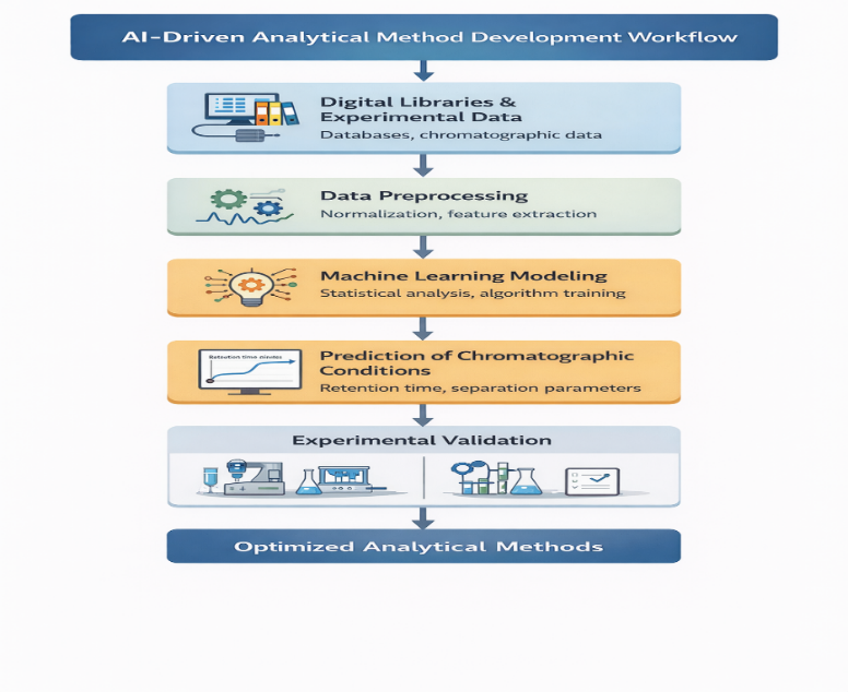 In this context, Artificial Intelligence (AI) has emerged as a promising avenue for contemporary pharmaceutical analytics. AI methodologies, including machine learning (ML), artificial neural networks (ANN), and deep learning (DL), facilitate the analysis of intricate experimental data, the elucidation of latent relationships among analytical variables, and the prediction of chromatographic behavior. By leveraging historical and experimental datasets, AI models can enable predictive optimization of analytical parameters, thereby substantially reducing the requisite number of experimental trials during method development.