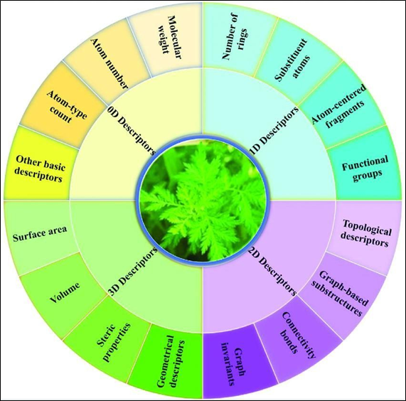 With the explosive growth of natural products, another key point in AI-based drug discovery and analysis is the transfer of molecules into computer-readable format, while keeping their intrinsic physicochemical properties.17Various types of descriptors have been proposed to represent drugs; these descriptors can be classified into four categories in accordance with their dimensionality (Figure 2). To speed up the drug discovery process, a chain of open-source toolkits have been suggested to compute molecular descriptors and structure representations, including OpenBabel18and ChemmineR.19The simplest molecular representation is the zero- dimensional (0D) descriptor; it is derived following the chemical formula ofdrugs.20The 0D descriptor generally encompasses molecular weight, atom number, atom-type count, and other elementary descriptors (e.g., number of heavy atoms).