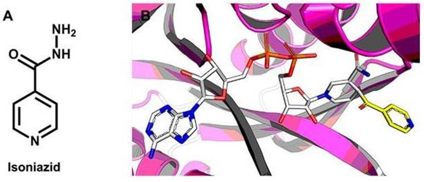 Figure 5. (A) Structure of the tuberculostatic drug isoniazid; (B) The isonicotinic-acyl moiety covalently bound to NADH in the binding site of InhA (PDB 1ZID, 2.70 Å). The protein backbone is represented as a cartoon. The isonicotinic-acyl fragment (carbon in yellow) and NADH (carbon in white) are shown as sticks.