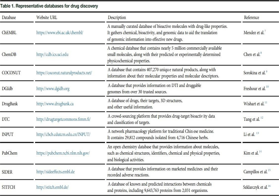 Major procedure includes (A) data collection and curation; (B) compound representations by using molecular descriptors; and (C) AI methods and their applications. ChEMBL is a manually annotated database that presently holds over 2 million compounds with drug-like properties.7ChEMBL collects data on the action mechanisms, molecular properties, absorption, distribution, metabolism, excretion, toxicity, therapeutic indications, and target interactions of the deposited compounds. ChemDB is an open-access database with about 5 million commercially available small molecules and their physicochemical properties, including molecular weight, solubility, and rotatable bonds.8 Besides these, a range of cheminformatics tools like Smi2Depict, MOL pro, AquaSol, and Reaction Predictor are incorporated into ChemDB, thus rendering the database convenient for drug discovery. The Drug-Gene Interaction Database (DGIdb) lists information on drug gene interaction and genes or gene products potentially capable of interaction with drugs.10Up until now, DGIdb encompasses over 40,000 genes and 10,000 drugs associated with greater than100,000 drug- gene interactions. Data are obtained from severalises sources using performance of expert curation and text mining. All of the genes submitted in DGIdb are assigned to 43 categories. Users may either navigate through the genes within a category or type in a list of genes or drugs to retrieve corresponding drug-gene interactions through the search module. Furthermore, DGIdb can be queried programmatically by API via the web-based interface. Drug Bank is an open-access reference drug database.11It now hosts 14,746 drugs with complete details of drug-drug interactions, drug-targets, drug classifications, and drug reactions. Users can search, browse, and extract text, images, and structural data in Drug Bank using the integrated tools. Drug Bank has emerged as the world's most popular resource for drug screening, design, and metabolism prediction. Drug Target Commons (DTC) is an open-access online resource that offers annotated and unannotated drug-target interaction (DTI) data.12For its latest release, DTC adds clinical trial information and disease-gene associations, enabling the chemical biology and drug-repurposing uses of compounds. Being anopen resource, DTC not only offers database dump but also APIto retrieve its deposited data. Discoveries of herb-focused drugs and the scientific explanation of traditional Chinese medicine. PubChem is an open-access chemical information database with the biological, physical, chemical, and toxic data of chemical molecules. All these facts are gathered from over 850 sources. PubChem allows its users to search for chemicals by entering molecular formula, structure, and other identifiers as keywords. Currently, PubChem has developed into one of the primary sources of data for computational drug discovery and design. Side Effect Resource (SIDER) is a drug-side effect database. The SIDER release under current version contains 1,430 drugs, 5,880 side effects, and 140,064 drug-side effect pairs. They can be navigated either through drugs or through side effects. The data have been applied to numerous areas, including predicting drug indications, min-ing side effects, and metabolic dysregulation identification. The Search Tool for Interacting Chemicals (STITCH) is a database that holds known and predicted chemical-protein interactions. The interactions include 9,643,763 proteins of 2,031 organisms, which were gathered from computational prediction, organism-to-organism knowledge transfer, and other data-bases. STITCH can be queried by users in various ways, including chemical and protein names, chemical structures, and protein sequences. For large- scale analysis, data in STITCH can be either bulk downloaded or accessed programmatically by API.