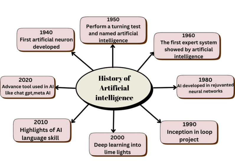 The history of artificial intelligence spans several decades with roots in computer science , mathematics and psychology. The term artificial intelligence was coined by John McCarthy. Rule based systems, problem solving and machine learning were explored.AI research focused on representing knowledge and building expert systems that mimicked human decision making. Funding and interest declined due to limitations and criticism of AIs potential. Advance in machine learning, neural networks and data analysis revived AI research. The availability of large datasets and computational power enabled significant break throughs in deep learning, leading to applications like image recognition, natural language processing and autonomous vehicles 9-12.