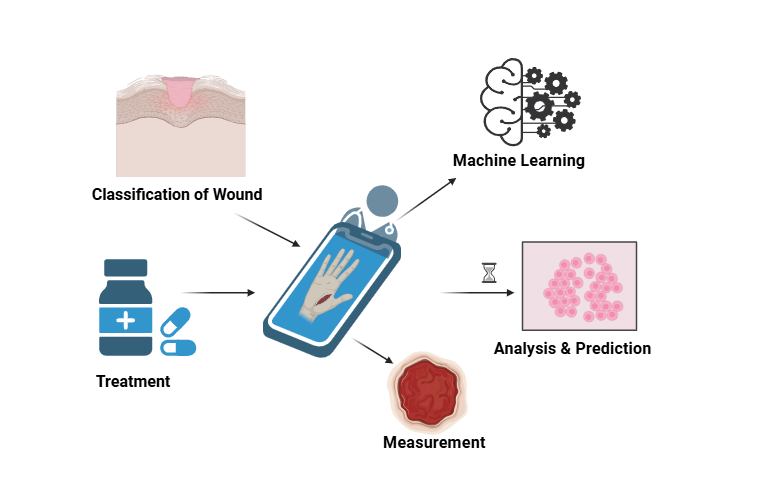 Chronic wounds represent a considerable worldwide challenge, characterized by localized injuries to skin and tissue that have a disrupted physiological healing response. [90] According to the Wound Healing Association, chronic wounds are characterized by a failure to return damaged tissue to its habituelle configuration and function within a regular timeframe and without delay. [91] The recovery phase for chronic wounds usually takes more than four weeks, which greatly diminishes the standard of life and well-being of those affected and contributes to higher mortality rates. [92] Thus, accurate evaluation, forecasting, and handling of persistent wounds are vital for alleviating the burden on the healthcare system and improving the pace and standard of patient recovery. [93]. In medical practice, routine lower ankle wounds like vascular, hypertensive, tension, and venous ulcers present a significant danger to aged, who are more vulnerable due to numerous age-related changes. Among these changes are a heightened occurrence of chronic ailments such as heart-related disease and diabetes, as well as issues like reduced mobility, incontinence, low body weight, inadequate nutritional condition, and cognitive impairment. [94-96]. Intrinsic changes associated with aging that affect skin wound healing—like altered inflammatory responses, lower amounts of supporting embedded structure and growth factors, retarded keratinization, and reduced angiogenic activity—play a role in the slower rates of wound closure observed in older adults. [97] The occurrence of such wounds has risen significantly with the aging society, thereby increasing the reliance on restricted healthcare resources. [98] To tackle this issue, scientists have created a wearable sensor driven by AI that is connected to sophisticated wound dressing bandages. For the purpose of monitoring chronic wounds and determining their healing stages, this system employs a deep-rooted artificially-designed neural network (ANN) algorithm. [99]. This near-field detecting système offers essential information for making treatment decisions and evaluating how effective wound care medications are. Chakraborty et al. have proposed a telemedicine model that employs Linear Discriminant Analysis for tissue type classification, attaining a tissues prediction precision. [100] With this approach, persistent wound healing statuses can be diagnosed remotely, providing clinicians with statistical tissue compositional data to support their decision-making. Furthermore, the evolution of statistical computing has accelerated the creation of a number of promising machine learning methods. [101]. Chronic wounds pose a major challenge to global health, making precise diagnosis and successful treatment essential for promoting healing and preventing additional complications. [102] AI is being used more and more in healthcare for predictive analysis of medical data, adjusting fluently to new details. [103] Even although digital medical documents are widely employed for wound documentation, managing and tracking all facets of patient care for individuals with chronic wounds remains challenging. [104] Nevertheless, utilizing machine learning and big data analytics holds considerable potential for lowering treatment costs, shortening the duration of simulations, and improving the comprehensive excellence of care. [105]