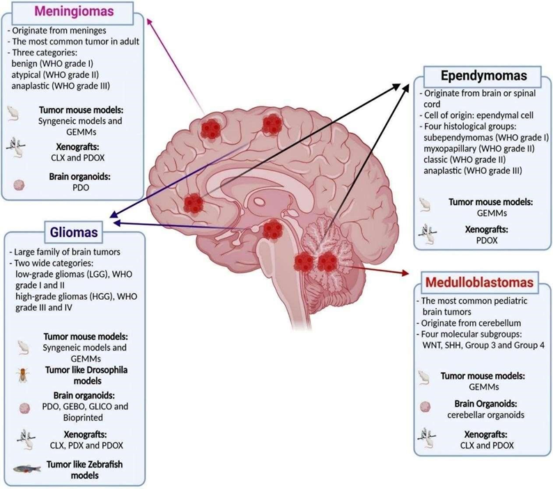 Brain tumors are growths that develop inside the brain due to cells growing in an abnormal and uncontrolled way. They are a mixed group of tumors, and each type grows and behaves differently. They also have different chances of survival and different treatment options. However, their symptoms, basic tests for diagnosis, and first steps of treatment are mostly similar for all types. Brain tumors can be classified in different ways, such as by the type of cell they come from, where they are located, how they behave, and their grade (how fast they grow). These classifications help doctors understand the type of tumor and how to treat it. Some important types of brain tumors include: