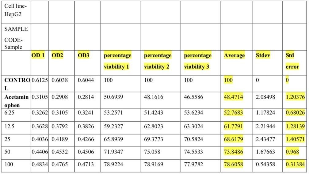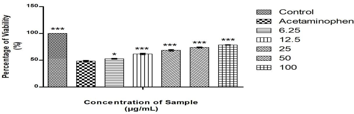 The study showed that acetaminophen greatly reduced the viability of HEPG2 liver cells, confirming its toxic effect. The sample treatment improved cell survival at all tested concentrations. As the dose increased, with the protective effect also increased, with the highest recovery seen at 100 g/mL. This shows that the sample can reduce the harmful impact caused by acetaminophen. Therefore, the sample demonstrates strong potential as a hepatoprotective agent.