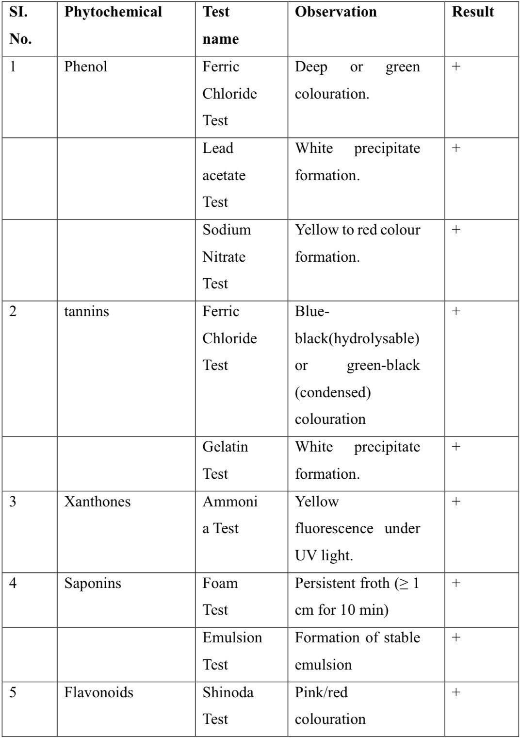 Preliminary phytochemical screening was carried out on the mangosteen leaf to identify the major classes of secondary metabolites present in the leaf. The phytochemical screening clearly show that mangosteen leaf extract contains a wide range of bioactive compounds. The presence of flavonoids, phenols, tannins,xanthones and saponins suggests strong potential for antioxidant, anti-inflammatory, antimicrobial and hepatoprotective activity.