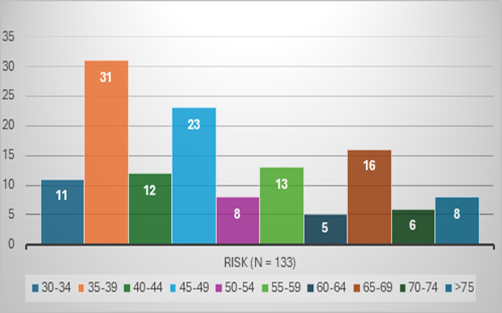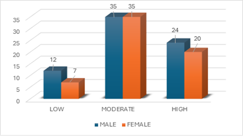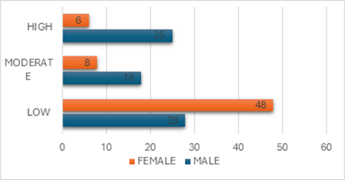 Males were predominantly in the moderate risk (18) and high risk (25) categories which is similar to the study conducted by Santi Susanti et.al who found that men had a higher risk of CVD compared to women. Similarly, Midhun Sasikumar et.al also found that males had a higher risk of CVD.