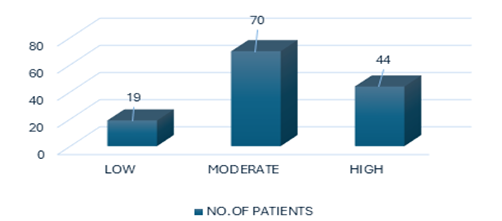 In the present study the distribution of the risk of CVD in out of 133 participants low risk 76 patients (57.1%), moderate risk 22 patients (16.5%), and high risk 35 patients (26.3%) which is similar to the study conducted by Ashit Kumar Paul et.al which shows in which 290 subject participants 61.7% low, 18.6% intermediate and 19.7% high.