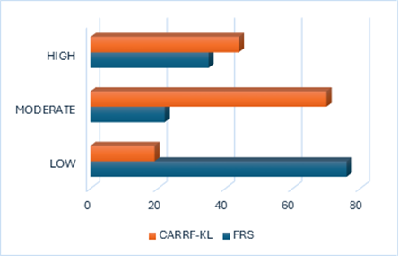 High risk FRS patients tended to have moderate (70) and high (44) knowledge levels suggesting that patients with perceived higher risk are informed but may lack actionable interventions which is similar to the study conducted by Nafiz et.al reported a correlation between higher CARRF-KL and higher FRS, similar to the study finding that high risk patients had better awareness but may not translate knowledge into action.