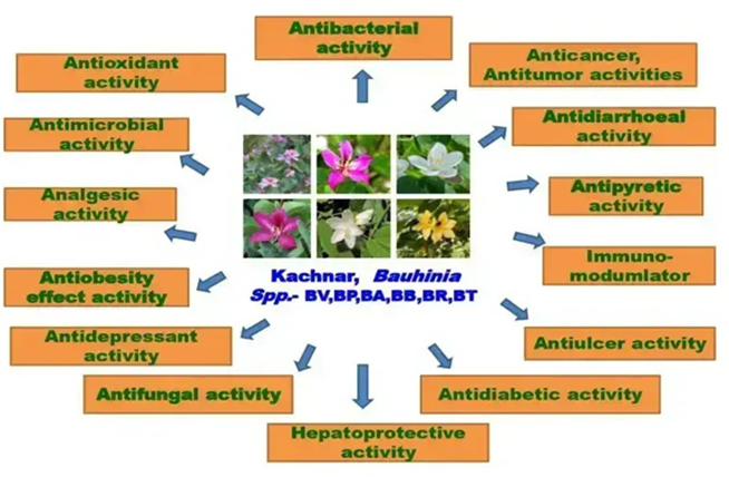 Figure 3: Graphical Illustration of pharmacological activities of Bauhinia Spp. - Kachnar (BV, BP, BA, BB, BR, BT)[40]