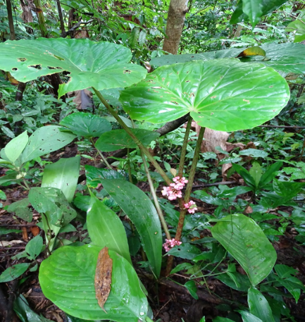 Leaves: Leaves are usually cordate, uneven and sharp at the base. The dimensions of the leaves are about 15-22.8 cm. having leathery leaves, with hairs on both surfaces or smooth, the leaves are alternate in arrangement and are one of the most distinctive features of the plant, the upper surface is usually dark green, while the lower surface often has a reddish or purplish hue, and the petioles are long and often reddish in colour.
