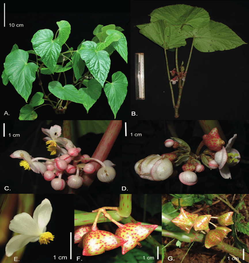 Figure 2: Begonia roxburghii. A-B. Plant habit. C. Male inflorescence. D. Female inflorescence. E. Male flower. F-G. Fruit.