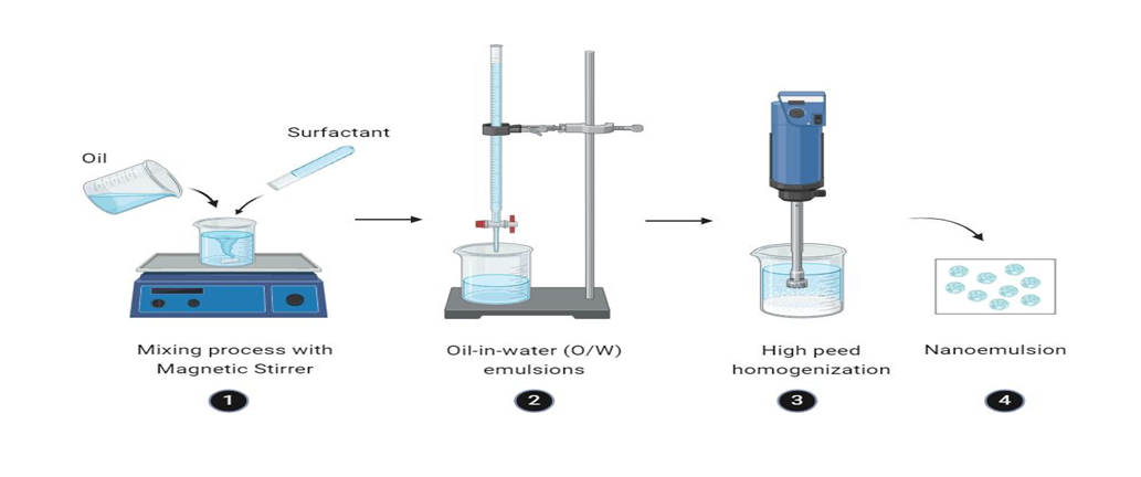 Nanoemulsions are colloidal systems containing submicron-sized particles, also known as submicron emulsions, ultrafine emulsions, or Mini emulsions. They generate homogeneous dispersions of two immiscible liquids, like water and oil, and are thought to be both kinetically and thermodynamically stable. An interfacial layer composed of surfactants and co-surfactants stabilizes these systems, ensuring a single-phase mixture. In nanoemulsions, a variety of surfactants with distinct characteristics both ionic and non-ionic are frequently used. In addition to anionic surfactants like potassium laurate and sodium lauryl sulfate, nonionic surfactants like sorbitan esters and polysorbates are also frequently used. Furthermore, zwitterionic and cationic surfactants such as quaternary ammonium halides are used. Oil-in-water (O/W) dispersions were the predominant form of nanoemulsions at first, with droplet sizes usually from 1-1000nm.The three primary categories in current classifications are water-in-oil (W/O), where water droplets disperse in an oil phase; oil-in-water (O/W), where oil droplets are dispersed in water; and bicontinuous systems, where water and oil form linked microdomains. It is easy to transition between these categories by changing the formulation components. Multiple emulsions, such as water-in-oil-in-water (W/O/W) or oil-in-water-in-oil (O/W/O) structures, are another type that involves protecting smaller droplets within larger ones. Oil-in-water (O/W) and water-in-oil (W/O) emulsions coexist in a single system in multiple emulsions, another type of nanoemulsion formulation. This dual-phase structure is stabilized by combining lipophilic and hydrophilic surfactants.