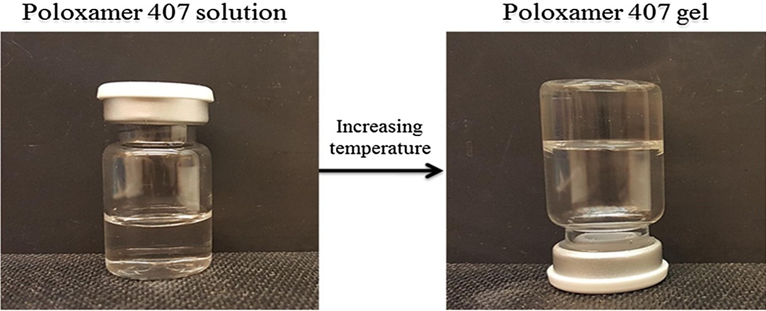 It is a tri-block copolymer that dissolves in water. In an AIBA arrangement, it contains two polyethylene and polypropylene oxides (35). Also referred to as Pluronic, it possesses excellent drug resistance time and good thermal setting qualities. It serves as a solubilizing and gelling agent. It produces translucent, colorless gel. It comes in a wide range of molecular weights with various gelling qualities. The ratio and partition of the hydrophilic and hydrophobic chains determine the gelling characteristic. Essential polypropylene oxide is enclosed in polyethylene oxide to form the poloxamer. It functions as a viscous liquid at ambient temperature (25 °C) and changes into a translucent gel at 37 °C. At low temperatures, it forms a small micellar subunit in solution; as the temperature rises, the viscosity increases, causing swelling and the formation of a large micellar cross-linking network (36.37).