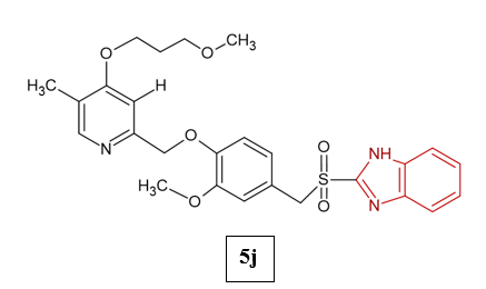 Radhamanalan et al. (2018) synthesized twelve racemic-substituted benzimidazoles (5a–l) via selective sulfide oxidation to sulfoxides and evaluated them for antiulcer potential using in vitro and in silico methods. All compounds showed strong, dose-dependent inhibition of H?/K?-ATPase, comparable to omeprazole, with compound 5j emerging as the most potent (IC?? = 0.025 μM; 86.12% activity vs. omeprazole’s 82.54%). Docking studies supported their strong binding to H?/K?-ATPase (binding energies −8.94 to −32.88 kcal/mol; ki = 0.027–2 μM). Safety assessment using HRBC membrane protection assays confirmed low toxicity, with 5d, 5i, and particularly 5j showing high stabilization (up to 98.45%)14.
