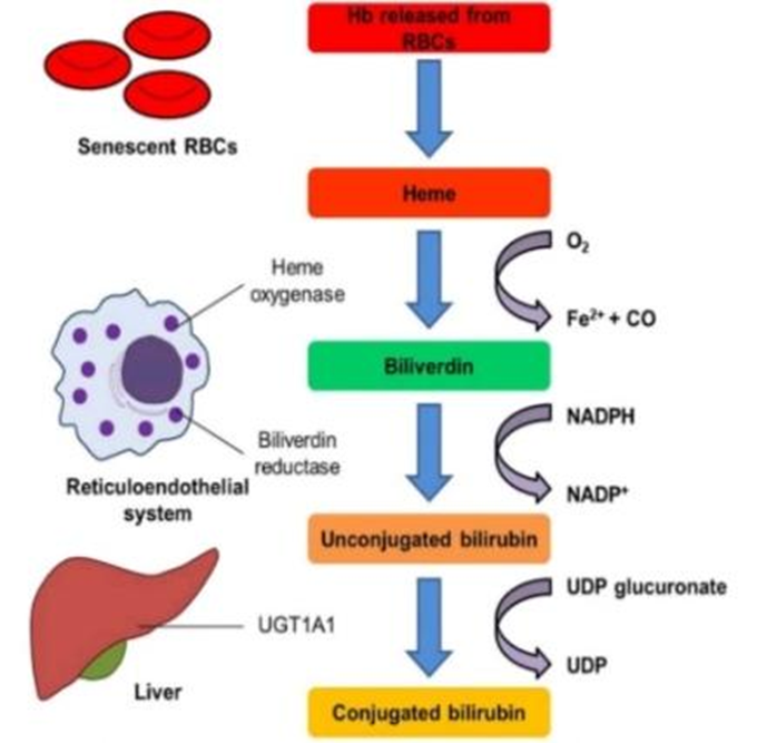 A yellow substance known as bilirubin is made when red blood cells break down. The liver helps process this substance before it is removed from the body, usually through bile and the bloodstream. When there is too much bilirubin, it can be a sign of a condition like jaundice, which makes the skin and eyes appear yellow. [9] Jaundice is quite common in newborns, affecting up to 60% of healthy babies during their first week. High levels of bilirubin can be harmful to the brain, and if not treated, may lead to problems with brain development.[10]