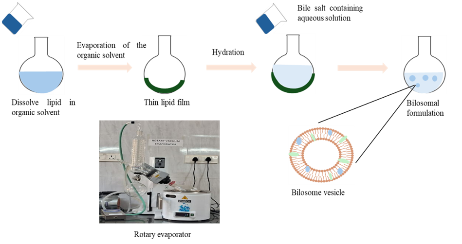 Among the different techniques thin film hydration method seen as the most common method employed. By using rotary evaporator, made a thin film of lipid and then add the aqueous solution to it. Lipid components like phospholipid, cholesterol and drug were dissolved in appropriate organic solvents such as methanol or chloroform or its mixture generally in round bottom flask. This organic phase then subjected to evaporation by using rotary evaporator under reduced pressure to form thin lipid film on the inner wall. Aqueous solution of bile salt which is prepared either with dissolving of bile salt with saline phosphate buffer or dissolved with distilled water or with any other solution is added to this thin lipid film with continuous agitation to get bilosomal dispersion. The resultant mixture then subjected to sonication with defined cycles and intermittent intervals for the reduction of particle size of the vesicles. Finally prepared bilosomal dispersion was kept in refrigerator for further characterisation.[19,20]