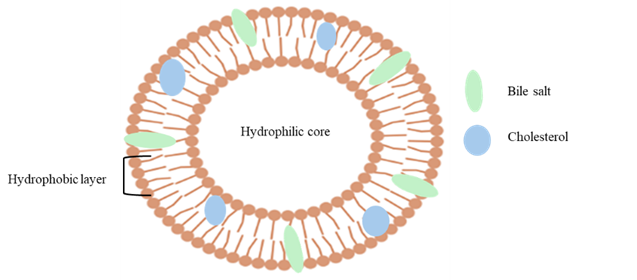 The liver produces endogenous amphiphilic steroidal molecules called bile salts, which are then released into the digestive system. They have unique hydrophilic (hydroxyl groups) and hydrophobic (methyl groups) surfaces due to their facial (planar) polarity, which facilitates effective interaction with biological membranes. Bile salts function as natural detergents in the digestive system, combining with phospholipids and dietary lipids to generate mixed micelles that improve the solubility of medications that are not very soluble in water and make it easier for the body to absorb them. There are various bile salts available for the formation of bilosomes such as Sodium deoxycholate (SDC), Sodium cholate (SC), Sodium glycocholate (SGC), Sodium taurocholate (STC), Sodium Tauro deoxycholate (STDC)etc. Among these Sodium deoxy cholate is the most commonly used.[10]