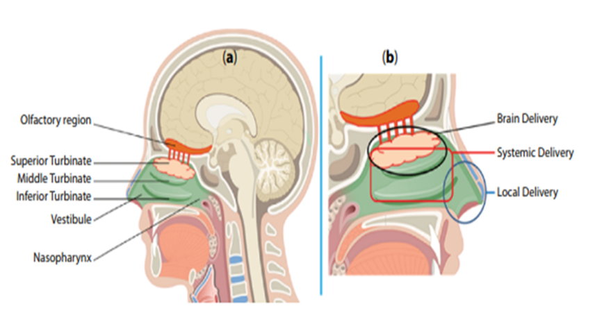 Fig 5: Illustration of the (a) Areas of Nasal Cavity (b) Possible drug delivery through nasal route [32]