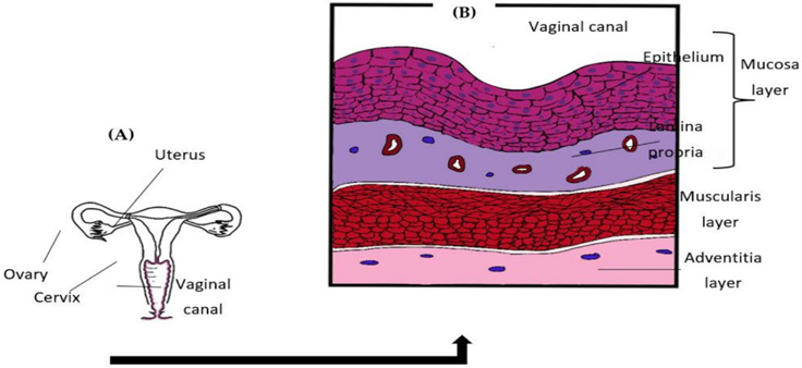 The vagina is made up of four separate layers: stratified squamous epithelium, lamina propria, and muscle layer, and adventitia as shown in the below figure-2. The mucosal layer generates a series of transverse folds known as rugae, which drastically expand its surface. Even though considered a mucosal tissue, the normal vagina does not have glands, and vaginal discharge is a mixture of fluids from a variety of sources. This mucus covering has various critical physiological functions, including drug absorption or activity. It is also worth noting that vaginal characteristics alter with the menstrual cycle, particularly pH and vaginal fluid: the usual pH ranges from 4.5 to 5.5, while vaginal fluid changes greatly in volume, content, and rheological qualities. Lactobacilli are abundant in the healthy vagina and play a crucial function in maintaining vaginal pH and controlling infection by common pathogens [20,21].