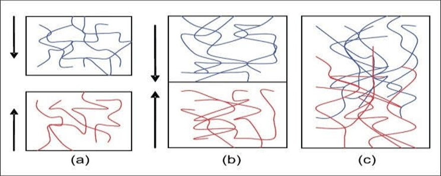 Fig.1: (a) Theory of diffusion -blue polymer layer and red mucus layer before interaction; (b) after interaction (c) The interface becomes diffuse after interaction for a period of time[11]