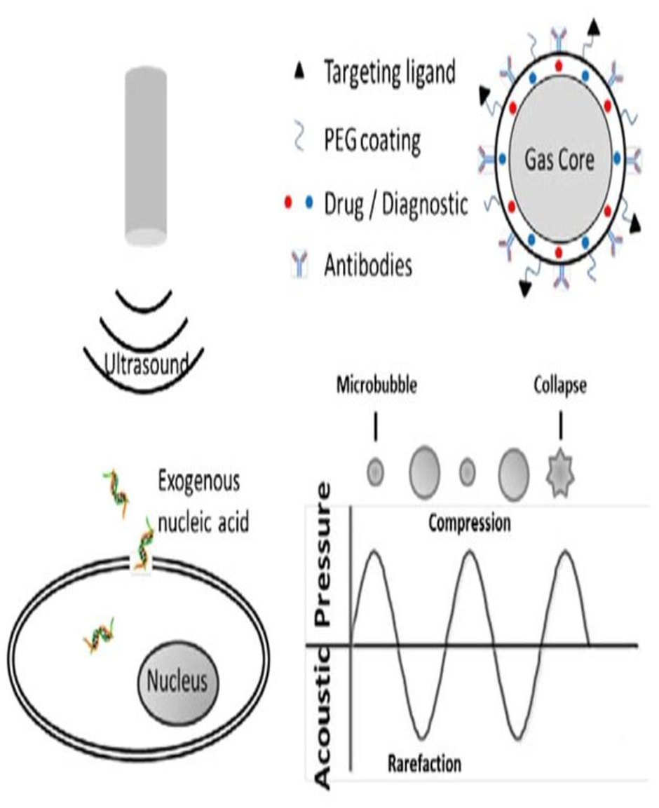 This is widely used and key factor for ‘Ultrasound Mediated Gene Transfer Method.’ Ultrasound-responsive lipid microbubbles (ULMBs) are gas-filled microspheres surrounded by a lipid shell that respond to ultrasound stimulation. These microbubbles are widely studied and used in biomedical applications due to their unique properties, particularly in drug delivery and diagnostic imaging. Microbubbles are 1–10 μm diameter gas-filled acoustically-active particles, typically stabilized by a phospholipid monolayer shell.[22-29]