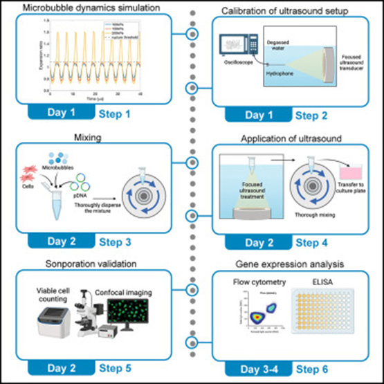 Here are the specific steps for the optimization of a sonoporation regimen using a 250-kHz ultrasound transducer, microbubbles, plasmid DNA and human mesenchymal stem cells (hMSCs). The overall goal is to transfer genes to mesenchymal stem cells and assess the resulting protein production. In our previous studies, we achieved targeted bone regeneration via activation of resident stem cells. Sonoporation was applied to deliver bone morphogenetic protein 6 (BMP-6) plasmid to the recruited MSCs within bone fractures to induce bone regeneration and fracture healing. This protocol is focused on in vitro sonoporation validation in support of translational studies of ultrasound-mediated gene delivery. With optimization of a few key parameters in the ultrasound treatment and cell culture conditions, we anticipate that this workflow is suitable for most in vitro experimental models.