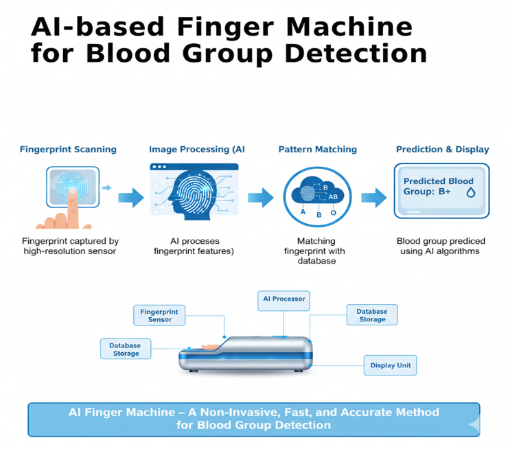 AI-based finger machines are a modern, non-invasive technology that can predict a person’s blood group by analyzing fingerprint patterns. This technology uses sensors, artificial intelligence, and machine learning algorithms to make accurate predictions without the need for blood samples [18].