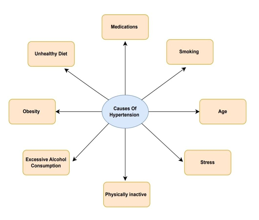 Inherited characteristics, poor lifestyles (like consuming excessive salt, gaining weight, and physical inactivity), and physiological mechanisms such as sympathetic nervous system hyperactivity and RAAS dysfunction all cause hypertension. Insomnia, endocrine imbalances, and renal disease are symptoms of secondary causes. [15
