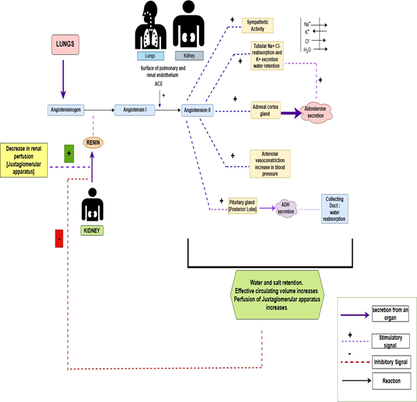 The kidneys release renin when the sympathetic nervous system is stimulated, when sodium levels are low, or when renal perfusion is reduced. Renin breaks down the liver's angiotensinogen to angiotensin I, which is subsequently changed into angiotensin II by the lungs' angiotensin converting enzyme (ACE). [15] Vasoconstrictor angiotensin II induces the adrenal glands to release aldosterone, which increases salt and water retention.[3] As a result, blood volume and systemic vascular resistance increase. Chronic hypertension causes endothelial dysfunction and arterial changing, and it is a risk factor for chronic cardiovascular disease over the long run.[12]