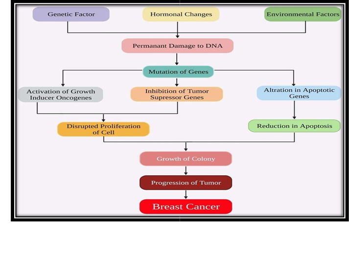 Genetic, hormonal, environmental, and psychological factors all play a role in The multifactorial growth of breast cancer. Known risk factors include family history, obesity, alcohol use, lack of movement, extended exposure to estrogen, and mutations in cancer suppressive genes including BRCA1 and BRCA2. Hormone receptor-positive (ER/PR+), HER2-positive, and triple-negative breast cancer (TNBC) belong to the subtypes of the disease; each has unique biochemical features, treatment responses, and prognoses