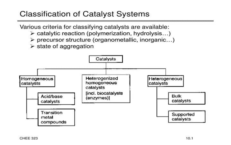 2. Heterogeneous catalysts:- Heterogeneous catalysts differ markedly from their homogeneous counterparts, as they exist in a distinct phase from the reactants, most commonly as solid materials. These solid catalysts provide well-defined surfaces on which reactants can adsorb, creating active interfaces where chemical transformations take place. Such surfaces contain a variety of active sites and structural features, contributing to the complexity and diversity of heterogeneous catalytic mechanisms.