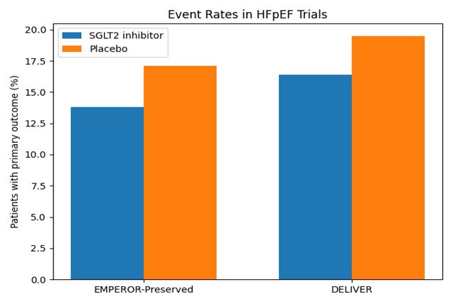 Figure 2 illustrates the proportion of patients who experienced the primary outcome in the treatment and placebo groups. In both trials, patients receiving SGLT2 inhibitors showed lower event rates compared with placebo, supporting the role of these agents in reducing worsening heart failure events in HFpEF.