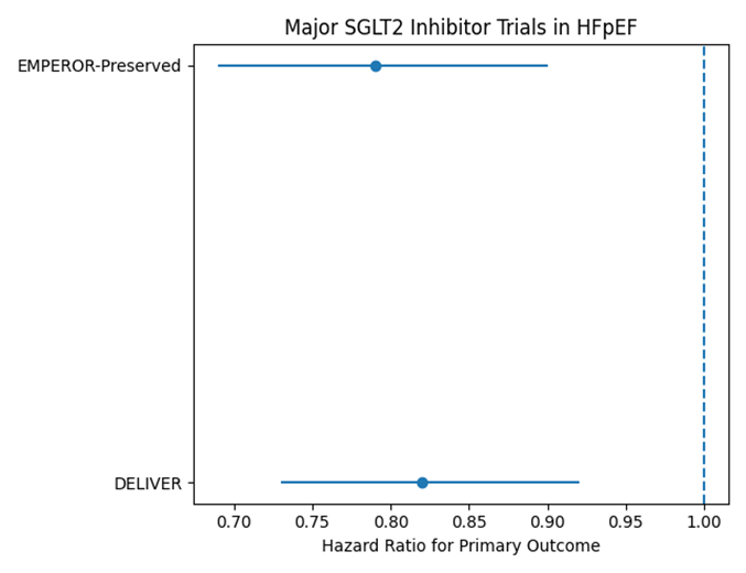 The clinical evidence supporting SGLT2 inhibitors in HFpEF is anchored by two landmark randomized trials that enrolled broad HFpEF and HFmrEF populations and tested fixed-dose therapy on top of usual care. The EMPEROR-Preserved trial evaluated empagliflozin in symptomatic patients with an ejection fraction greater than forty percent and demonstrated a significant reduction in the composite of cardiovascular death or hospitalization for heart failure, with a hazard ratio of 0.79. A critical point is that the observed benefit was largely driven by fewer heart failure hospitalizations, consistent with the concept that SGLT2 inhibitors stabilize congestion and reduce worsening heart failure events. The DELIVER trial evaluated dapagliflozin in a similar population across mildly reduced and preserved ejection fraction and also showed benefit on a composite endpoint of worsening heart failure or cardiovascular death, with a hazard ratio of 0.82. Across both trials, the direction of benefit was consistent in key subgroups, including patients without diabetes, reinforcing the idea that these drugs should be considered heart failure therapies rather than simply diabetes medications (19).